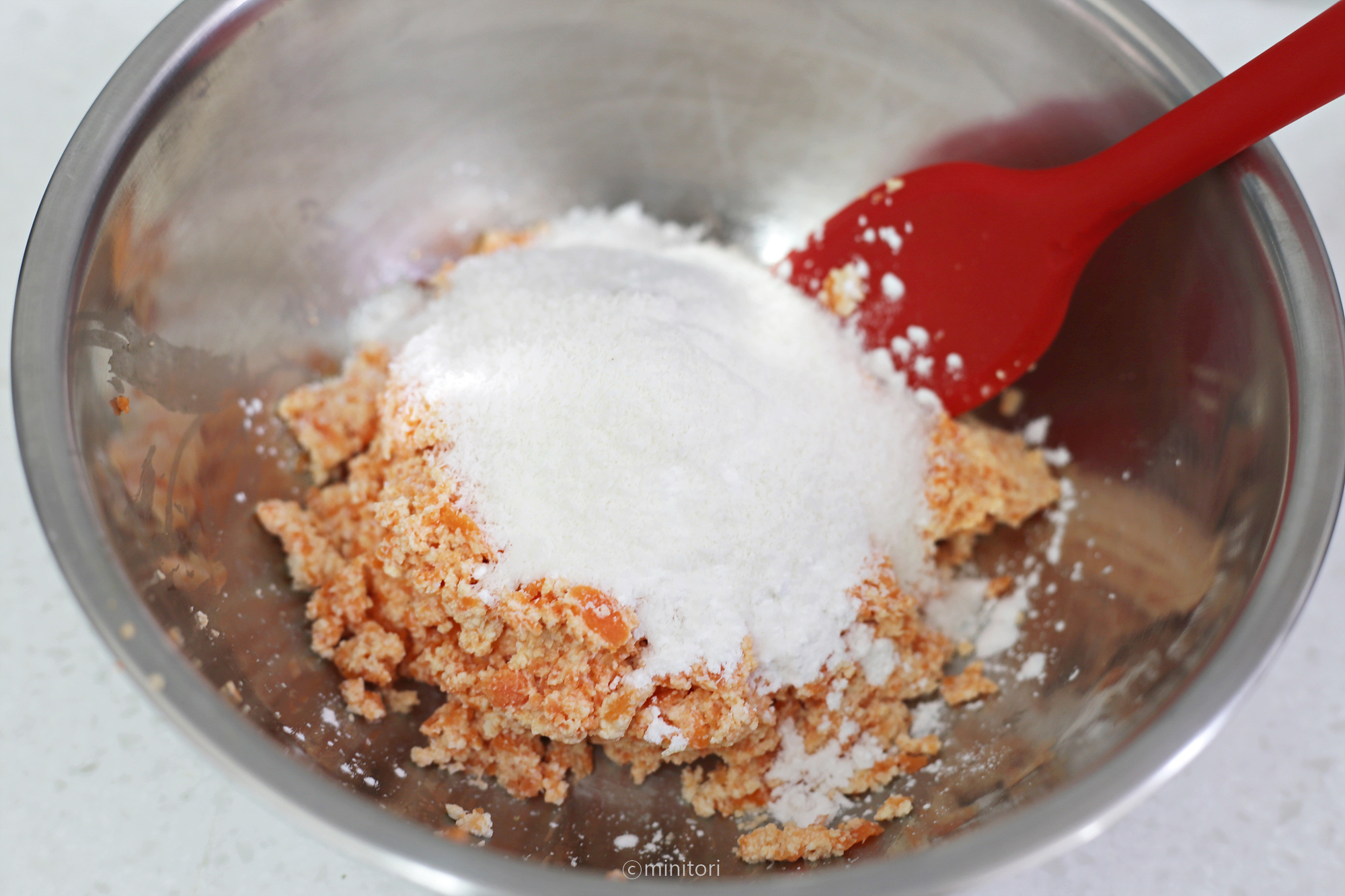 4. 3을 넓은 볼로 옮기고 분량의 쌀가루, 베이킹파우더, 코코넛가루를 넣고 섞는다.