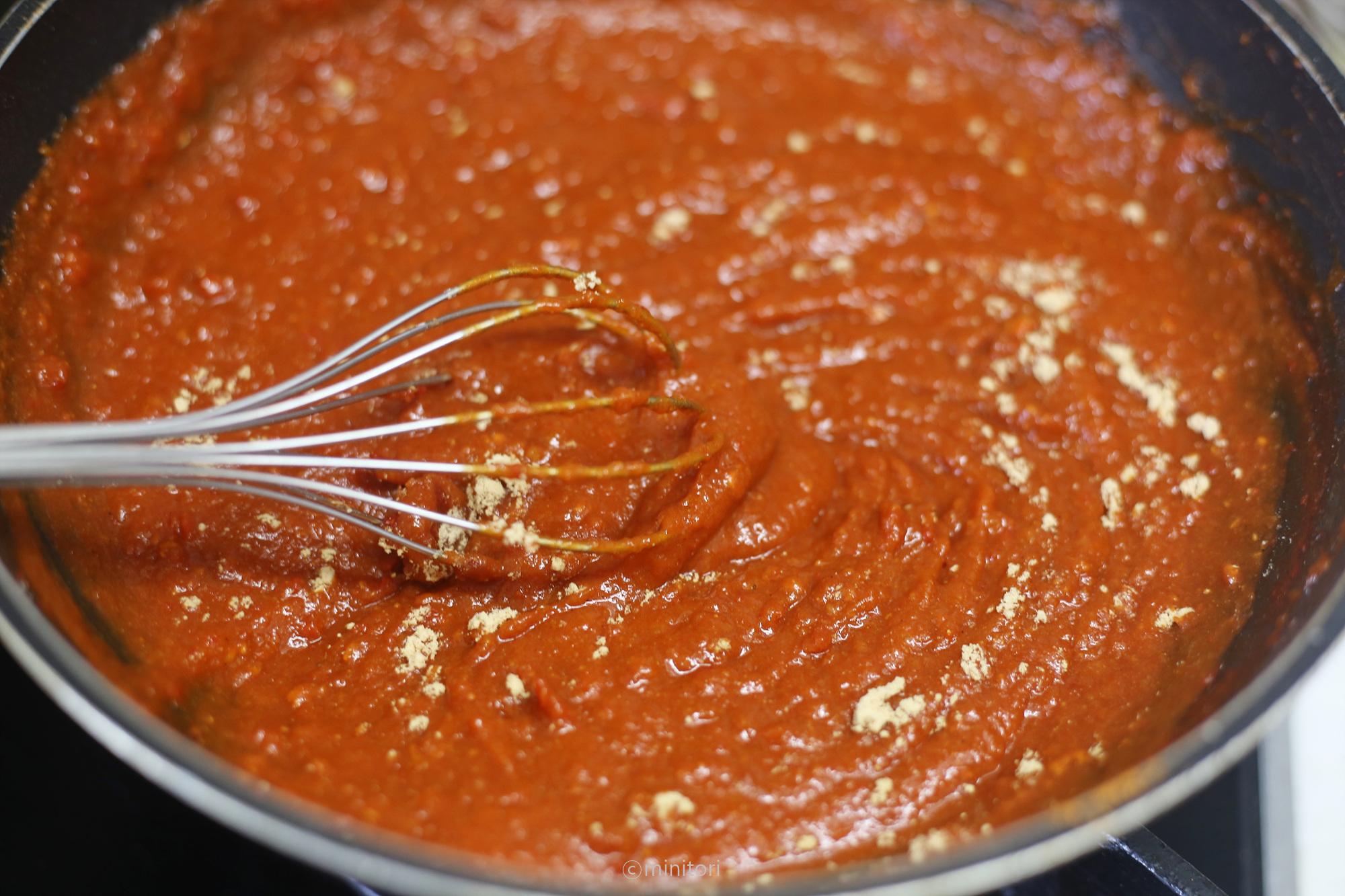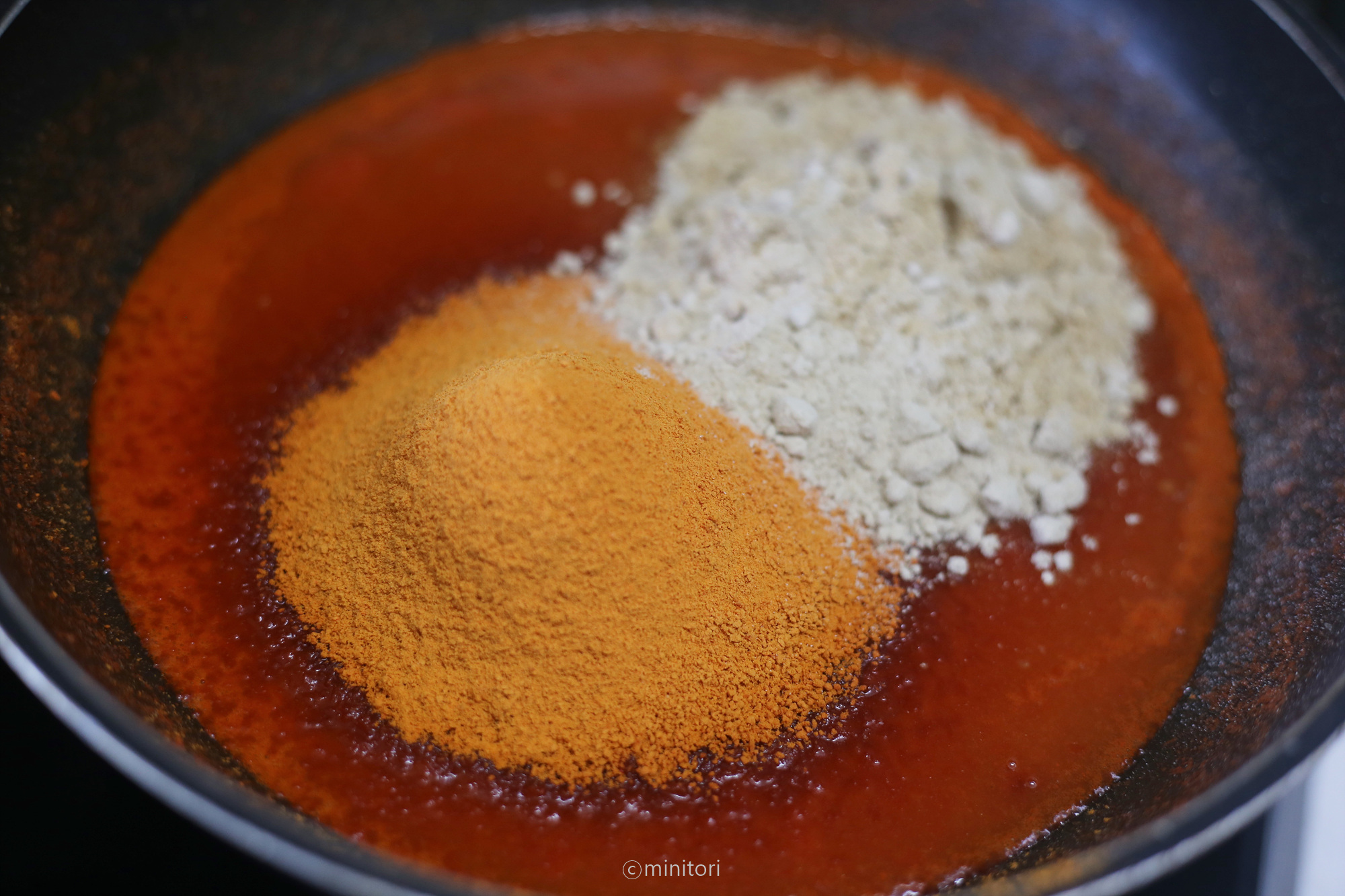 7. 미지근할정도로 식으면 파프리카가루, 청국장가루, 표고버섯가루, 마늘가루를 넣고 가루뭉침이 없도록 잘 섞어준다. (국산 파프리카가루는 뭉쳐져 있는 경우가 많아요. 가루가 뭉쳐져 있다면 마른재료용 믹서에 넣고 갈아서 사용하거나 체에 내려서 뭉쳐있는 가루를 풀어서 사용하시는게 좋아요)