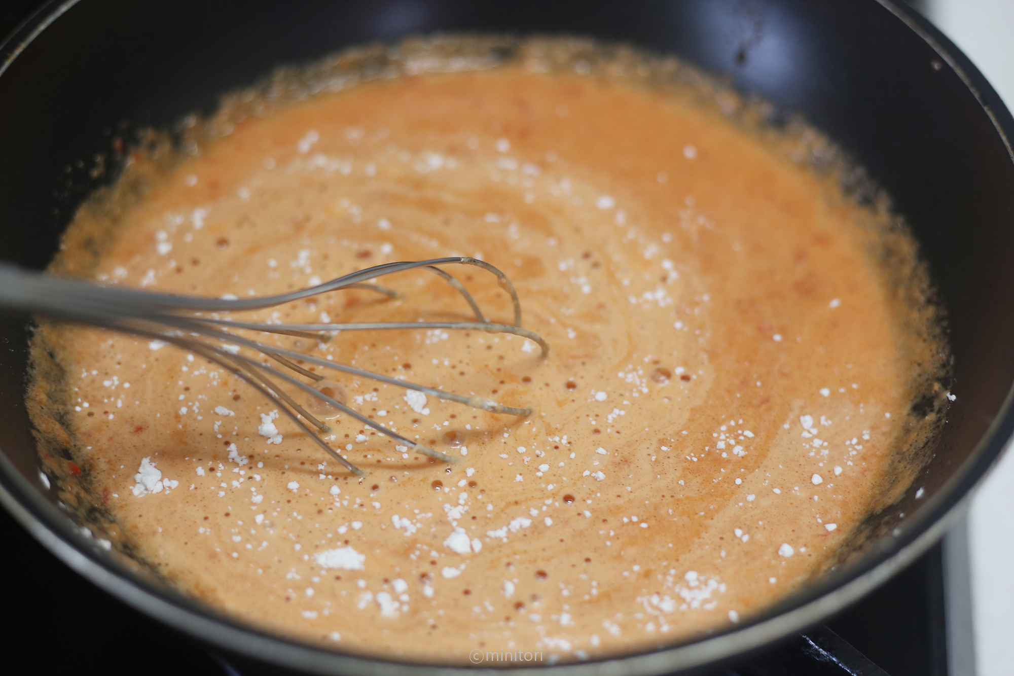 5. 냄비에 믹서에 간 내용물과 찹쌀가루를 넣고 중약불에서 거품기로 저어가며 살짝 점도있게 흐르는 상태가 될때까지 끓인 후 불을끈다.