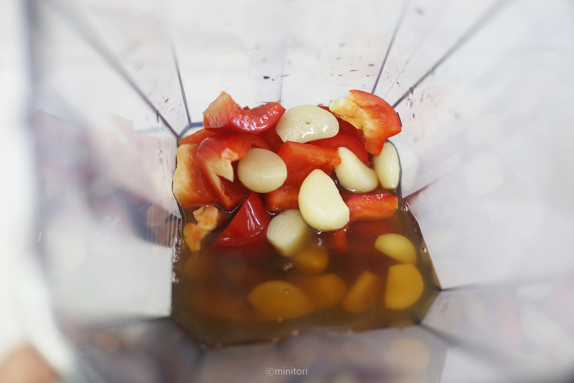 4. 믹서에 손질한 파프리카, 찐마늘, 베이비채수 2봉을 넣고 곱게 갈아준다.