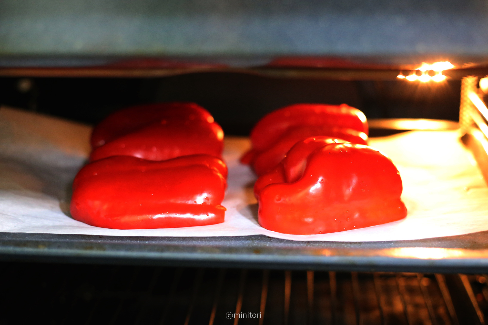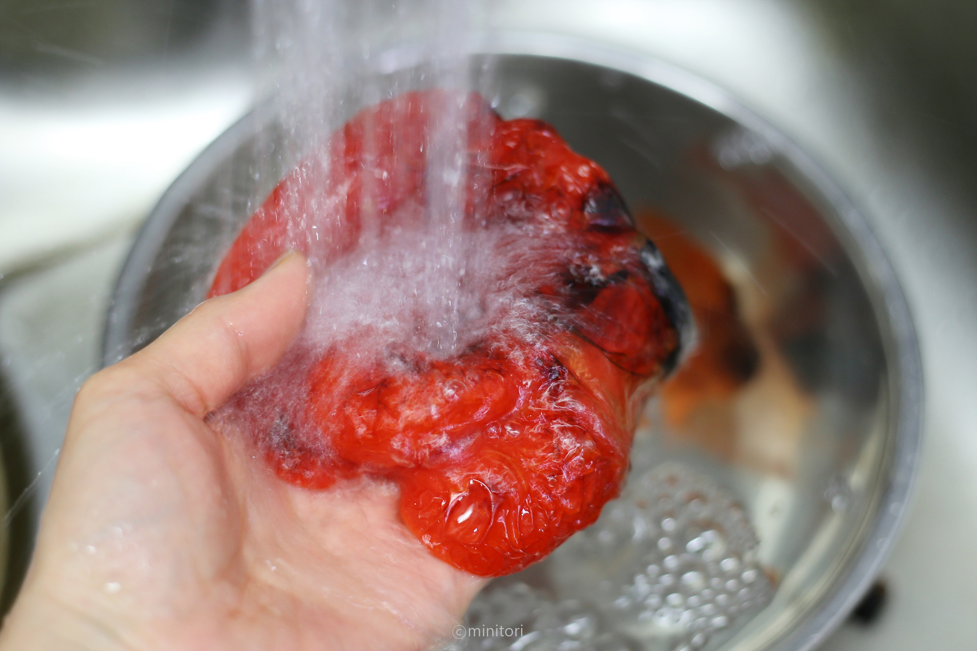 3. 구운파프리카는 찬물에 헹구고 껍질을 벗긴다.