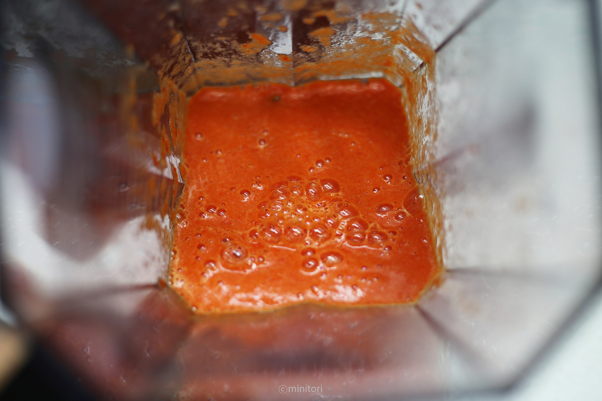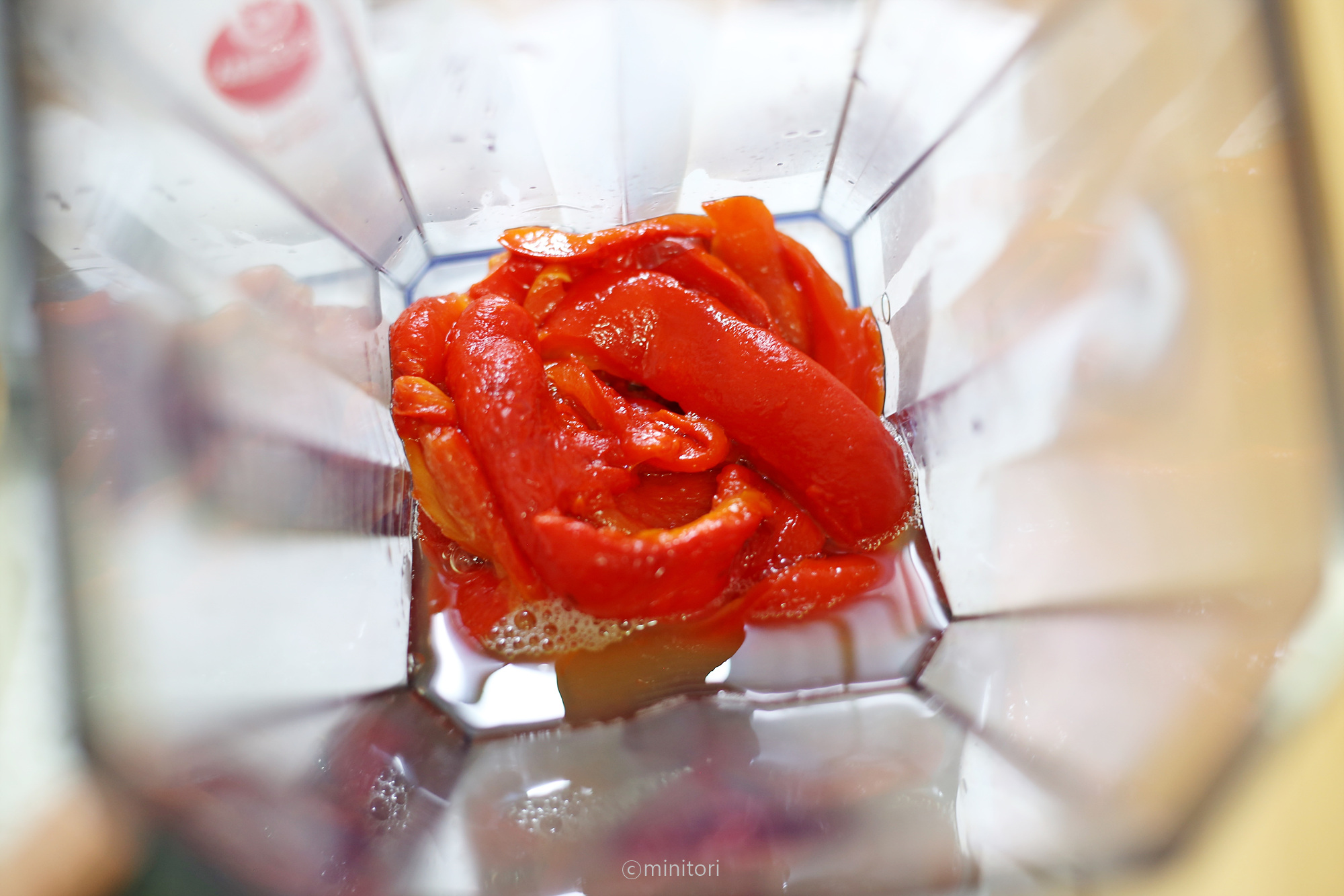 4. 믹서에 껍질벗긴 구운파프리카와 사과즙을 넣고 곱게 간다.