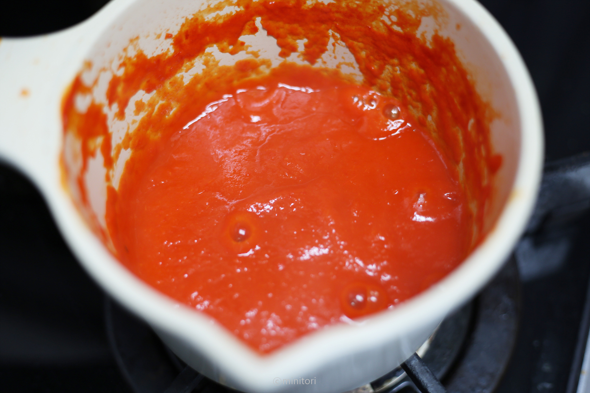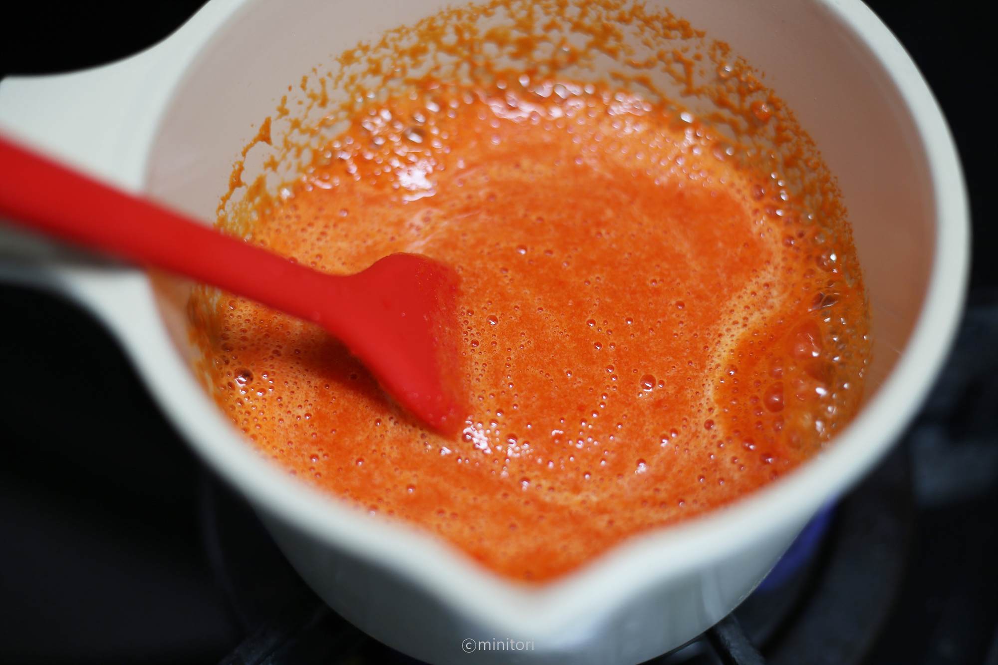 6. 내용물이 끓으면 중약불로 줄이고 타지않게 주걱으로 중간중간 저어가며 수분을 날리며 페이스트 질감이 될때까지 조린다.