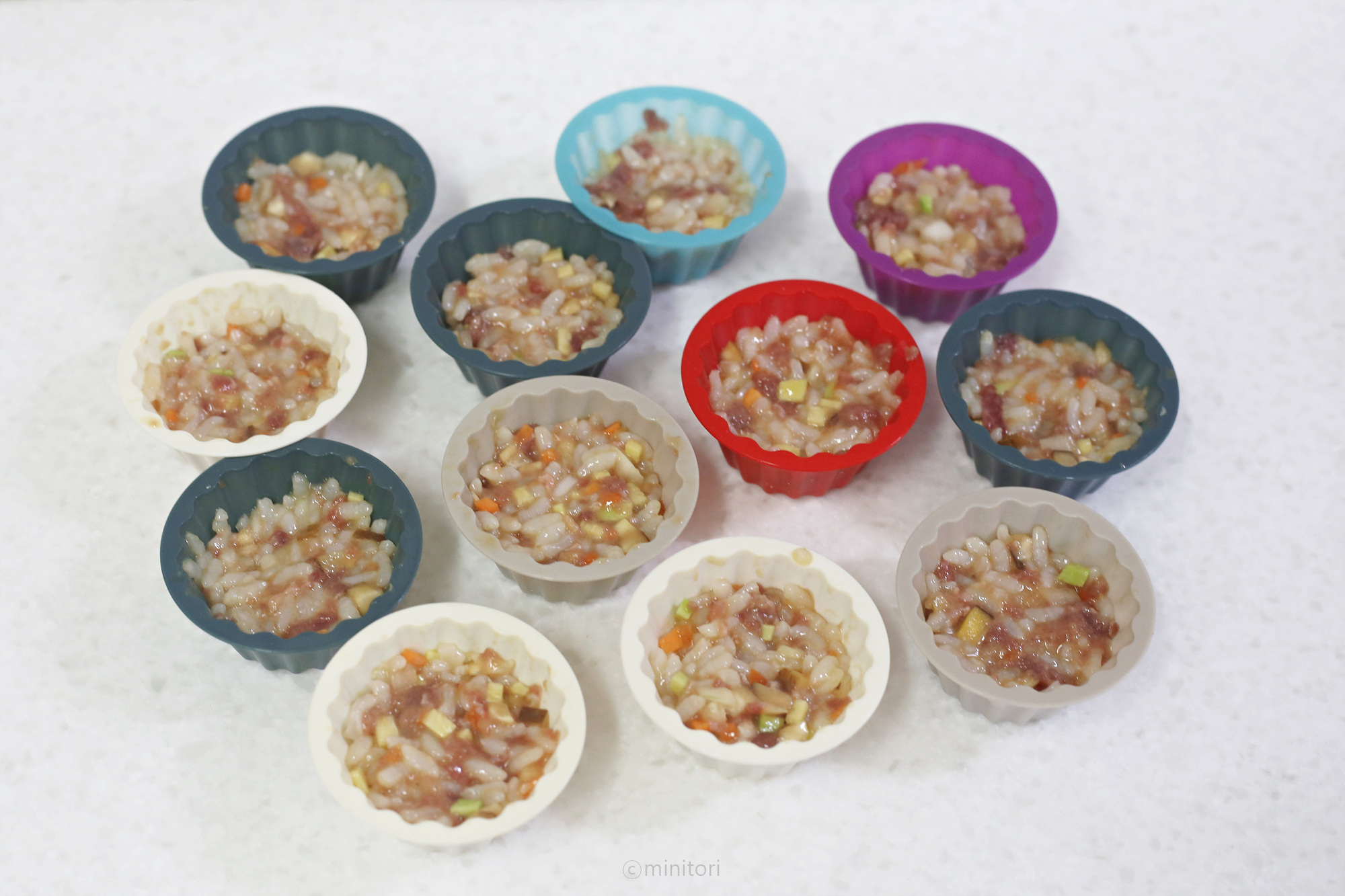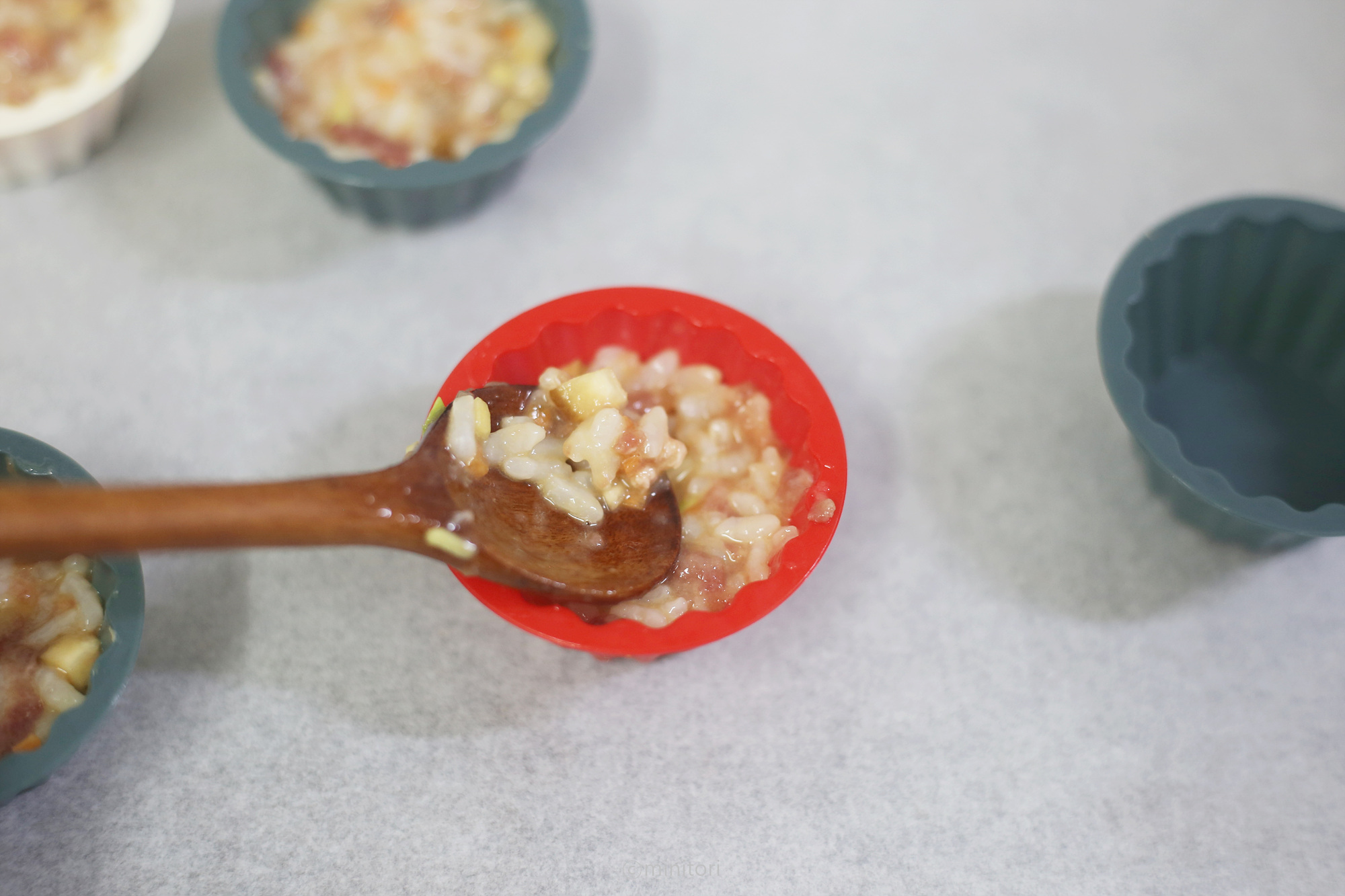 3. 머핀틀에 2/3정도 채워 담는다. (오븐, 찜기사용 가능한 틀이면 뭐든 ok! 실리콘틀로 만들면 완성된 머핀을 빼내기가 더 수월해요)