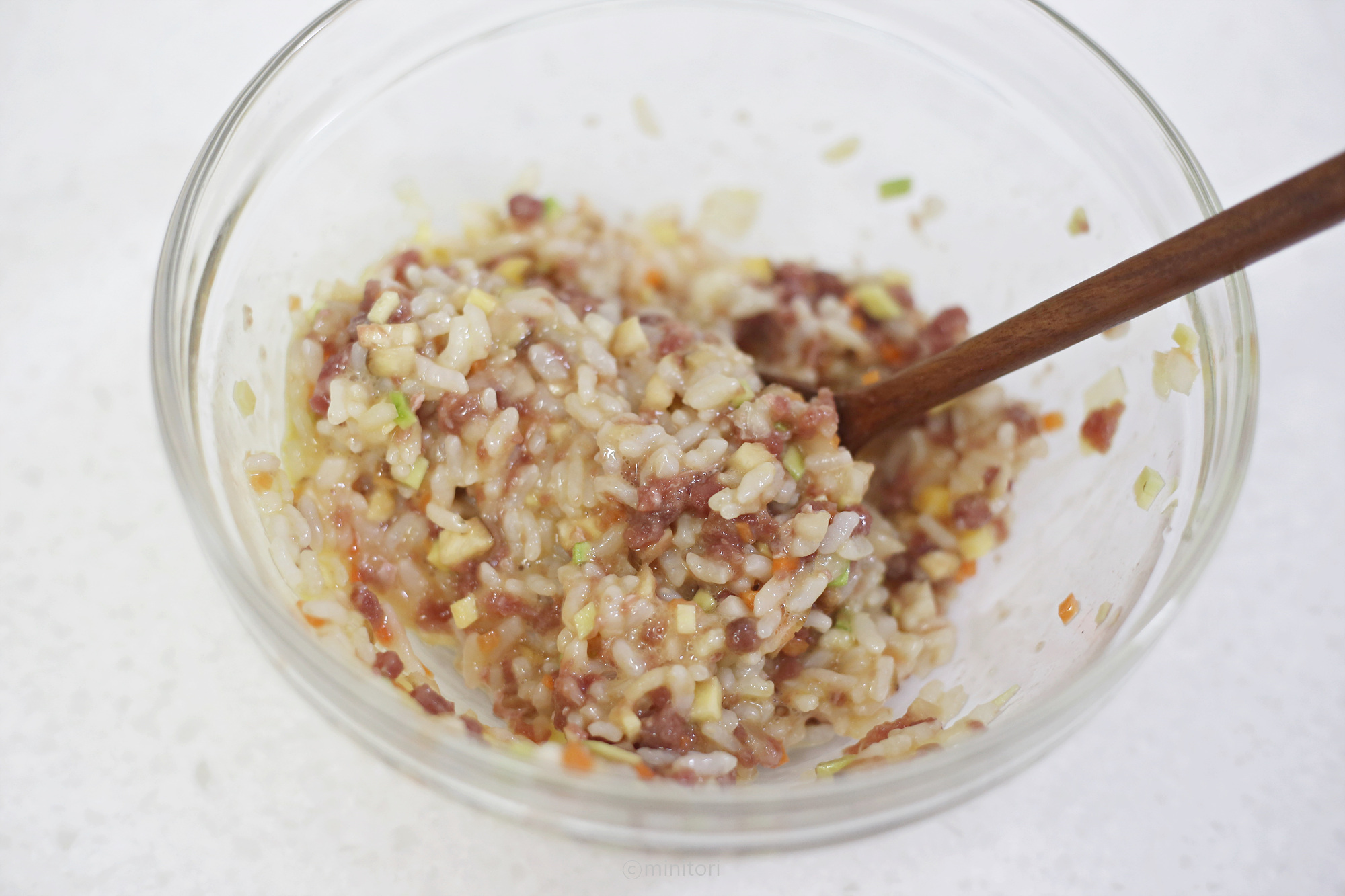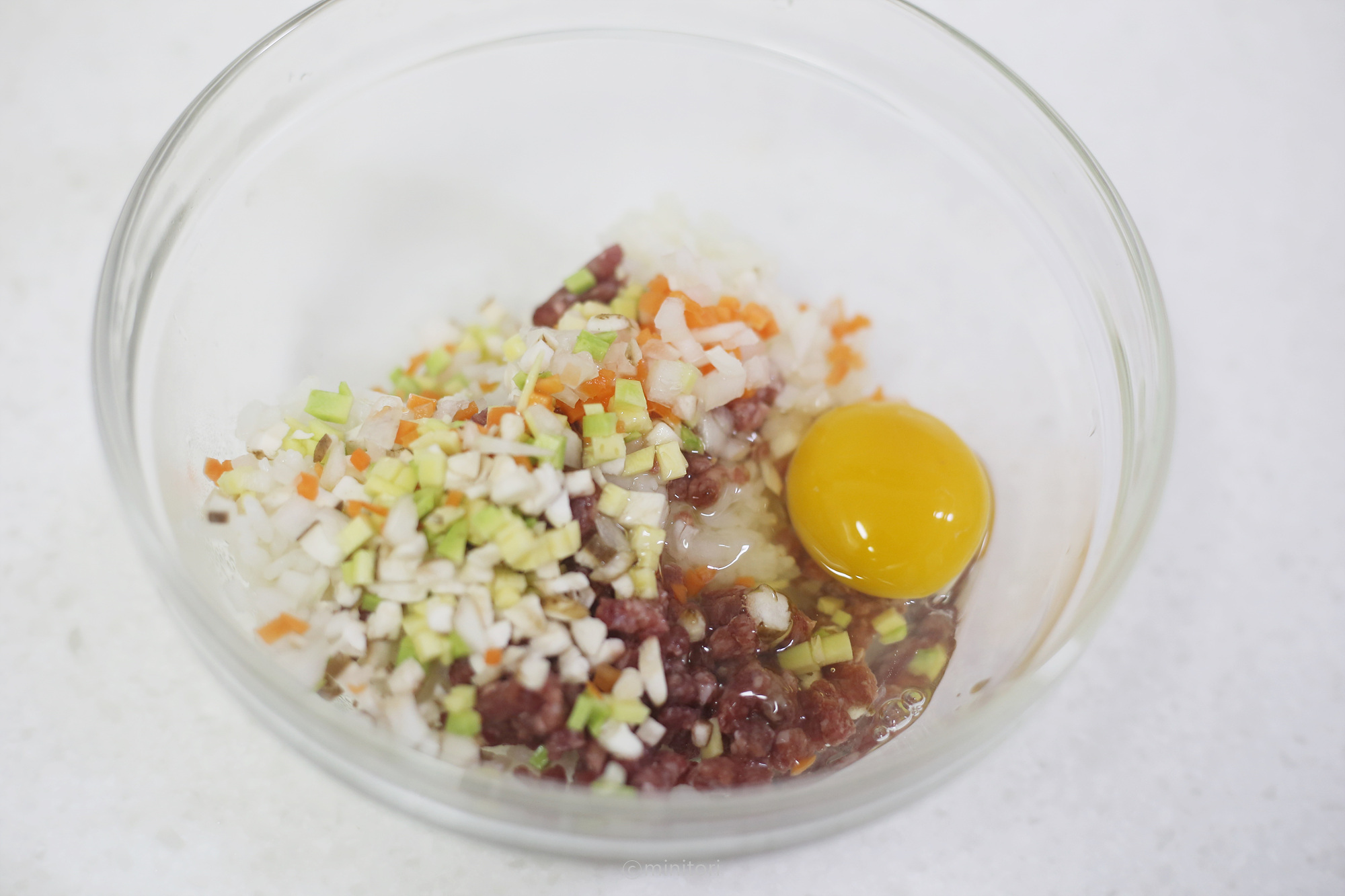 2. 볼에 밥(진밥) 다진야채, 참기름, 달걀1개를 넣고 재료가 잘 섞이도록 숟가락으로 섞는다.
