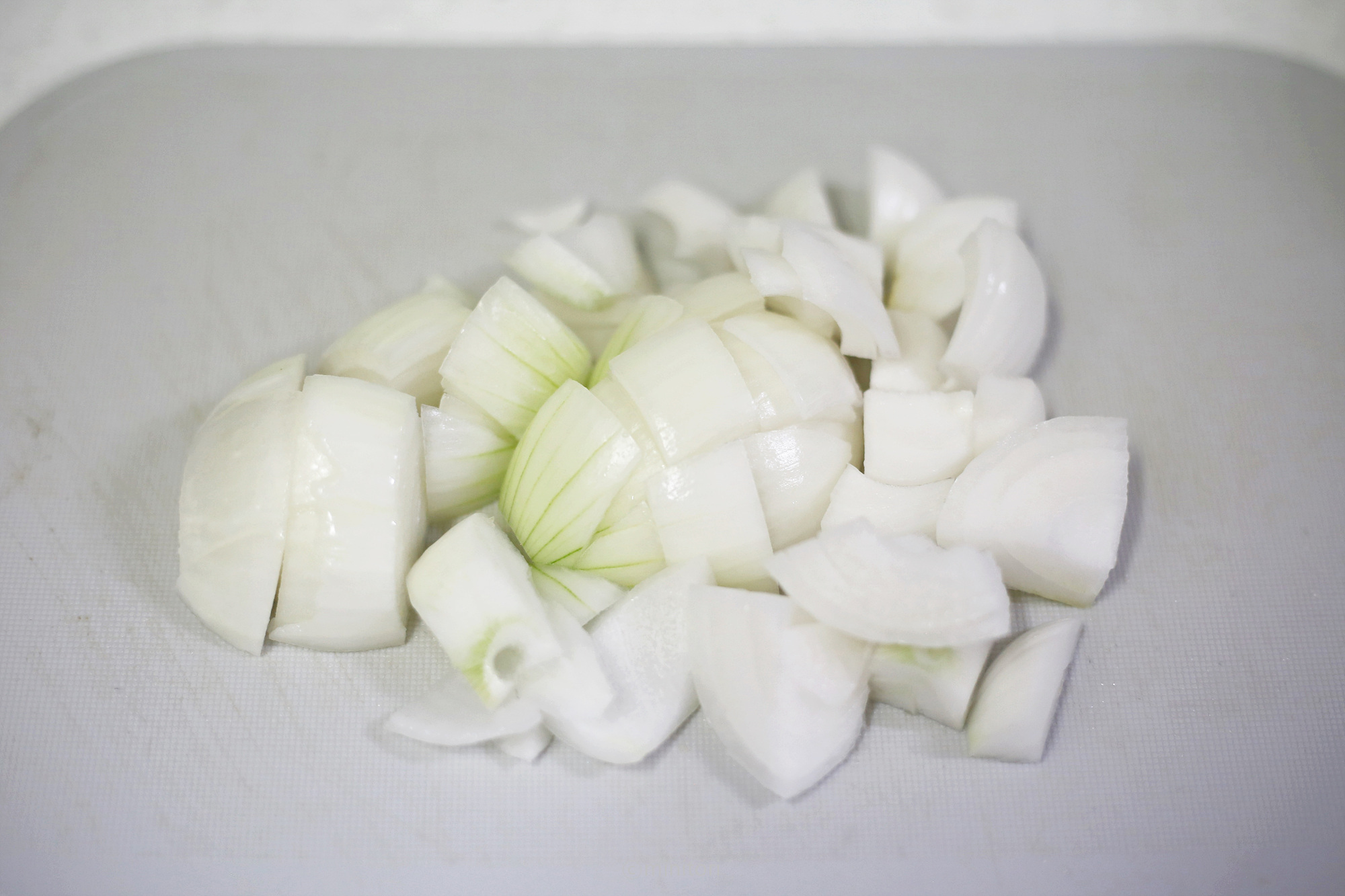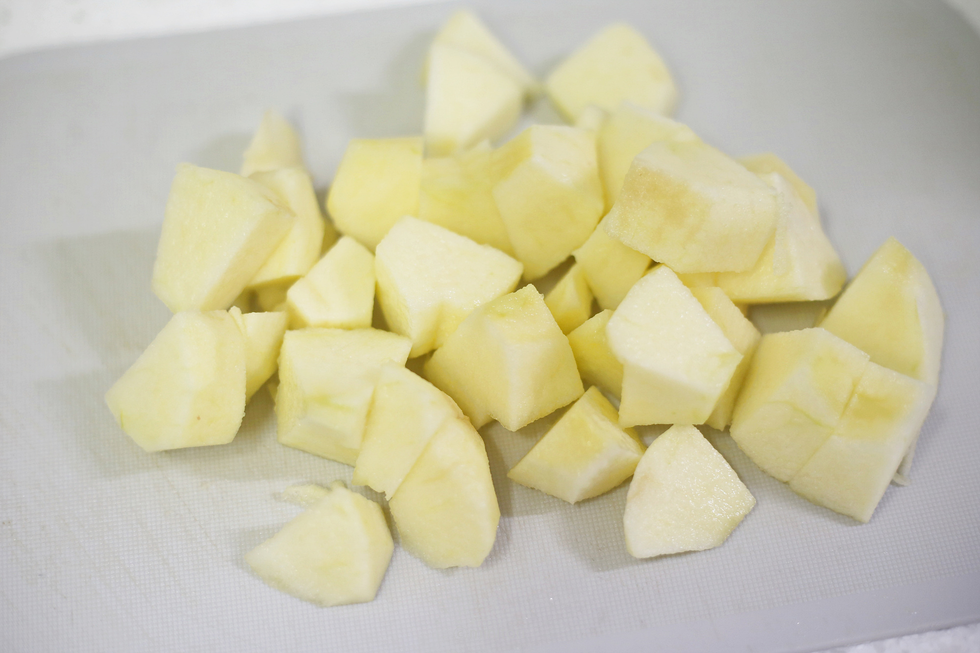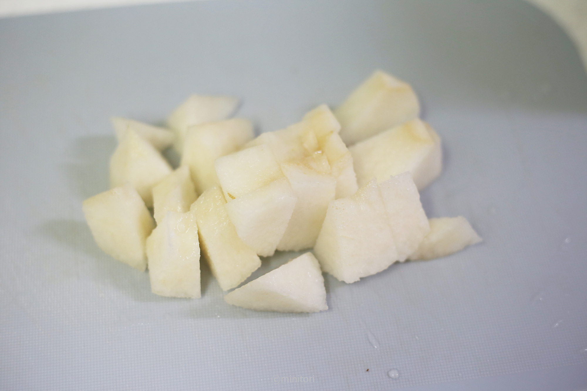4. 껍질벗긴 토마토, 사과, 배, 양파를 믹서에 갈기 적당한 크기로 썬다