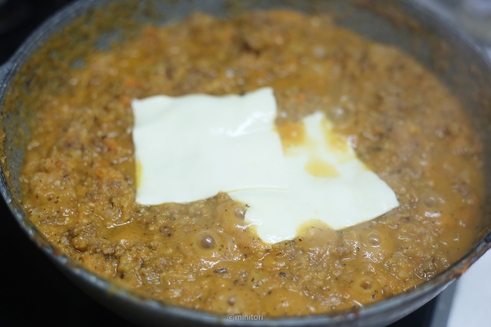 11. 뚜껑을 열고 수분이 거의 다 날아갈때까지 약불에서 중간중간 저어가며 졸이고 수분이 거의다 졸아들면 아기치즈 2장을 넣고 섞는다.