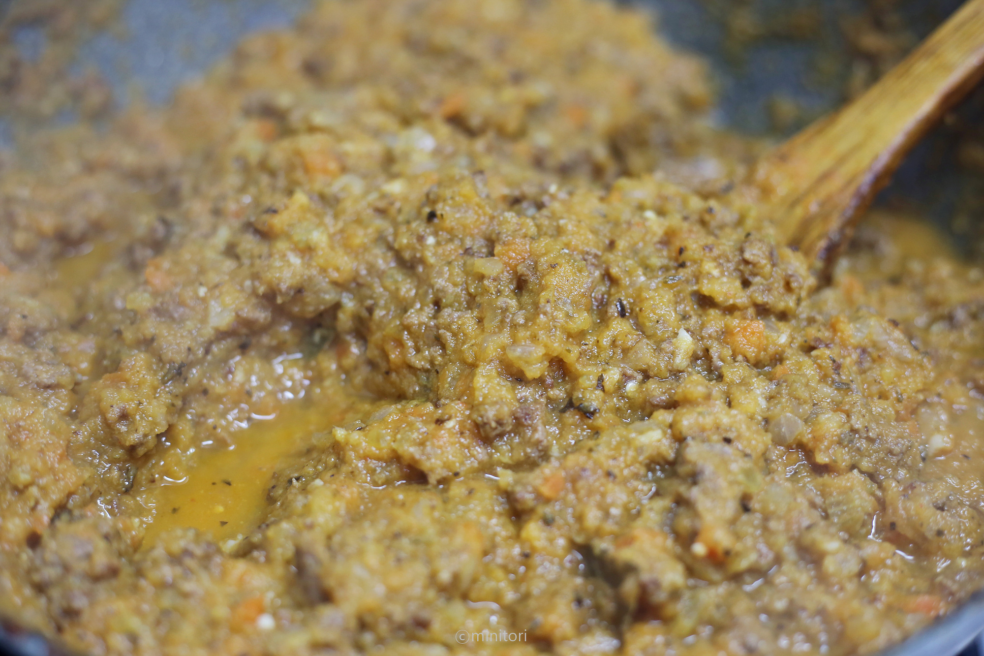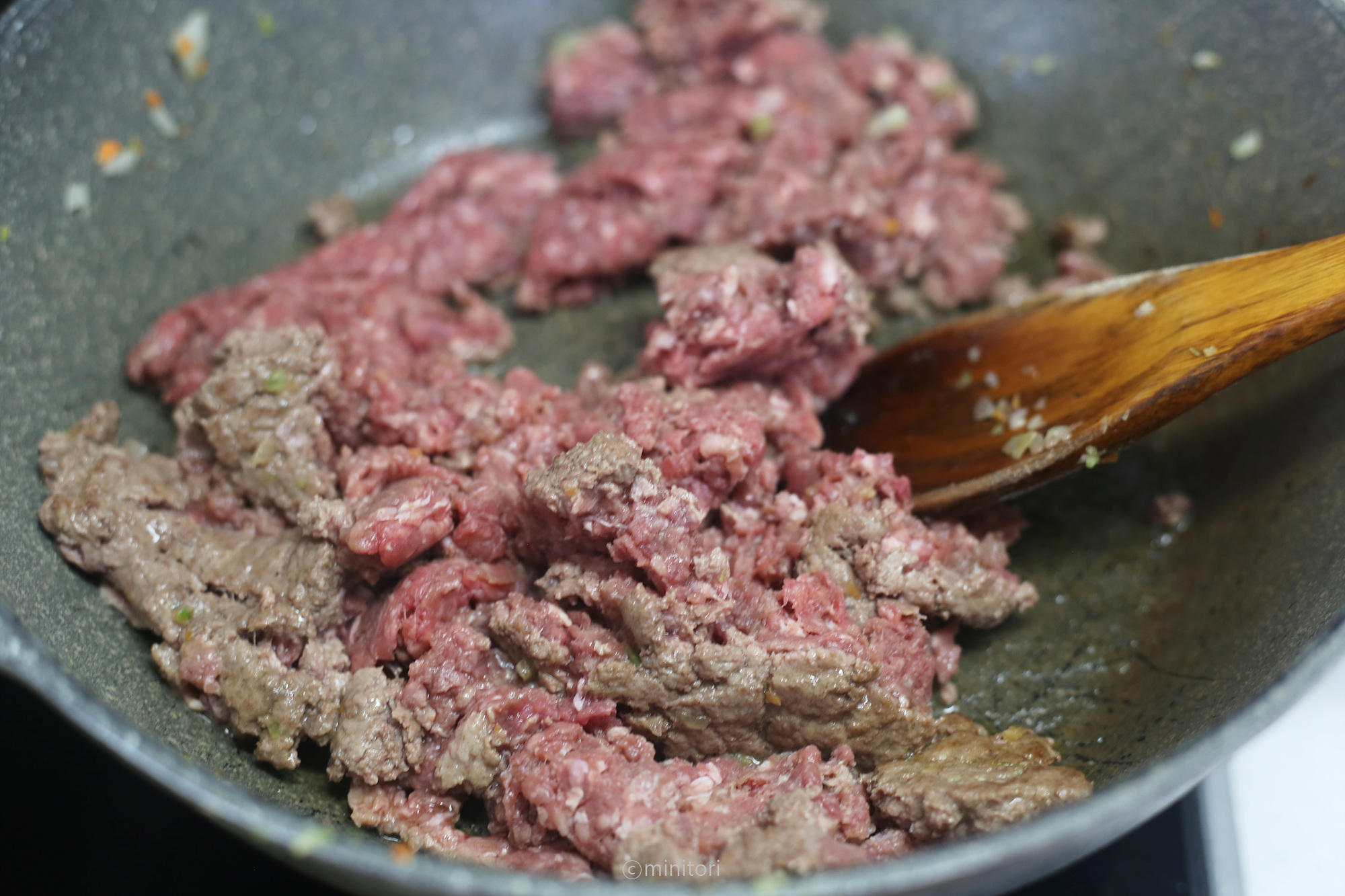 8. 볶은채소는 따로 덜어두고 올리브유를 두르고 다진소고기를 넣고 완전히 익을때까지 볶는다.