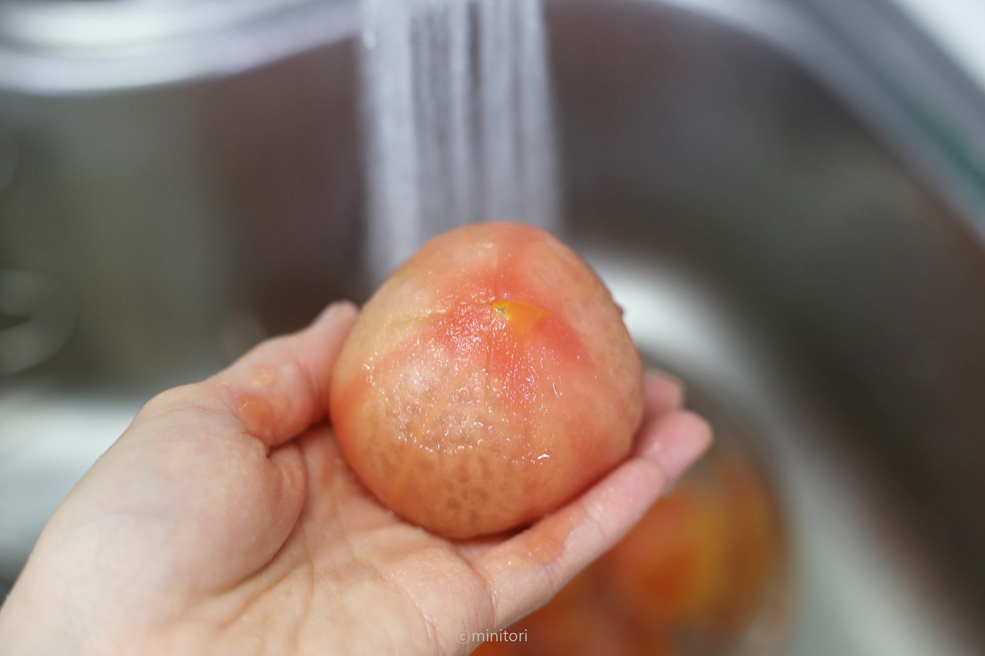 3. 토마토는 칼로 꼭지를 도려내고 아랫부분에 십자로 칼집을 내고 끓는물에 30초 정도 데쳐 찬물에 헹궈 껍질을 벗긴다.