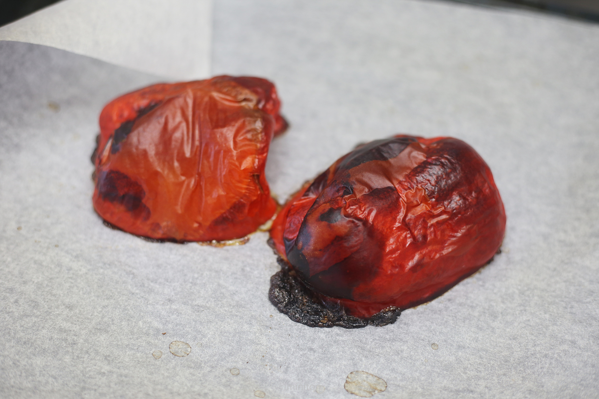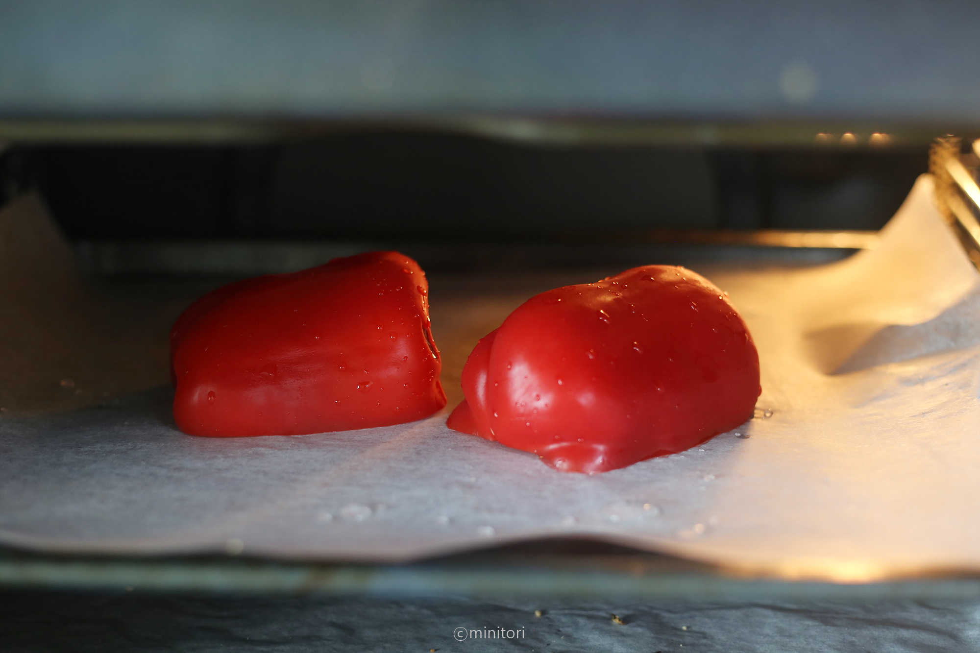 1. 파프리카는 반으로 잘라 꼭지와 씨를 제거하고 껍질부분이 위로 향하도록 오븐팬에 놓고 200도 온도에서 25~30분정도 껍질부분이 탈 정도로 굽는다.