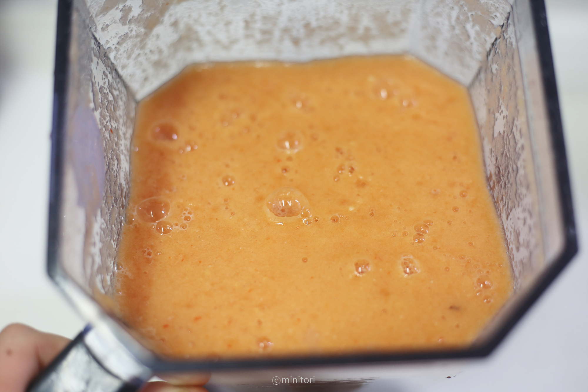 6. 믹서에 토마토, 사과, 배, 양파, 구운파프리카를 넣고 곱게 갈아준다.