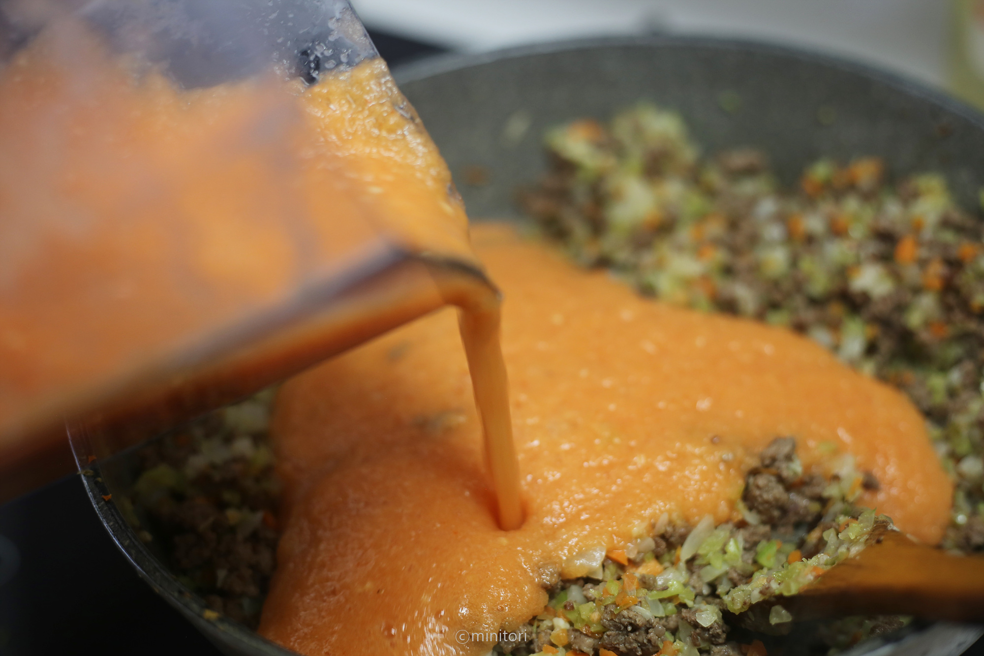 9. 8에 볶아놓았던 야채를 넣고 2~3분 정도 더 볶은 뒤 믹서에 갈은 내용물을 모두 붓는다.