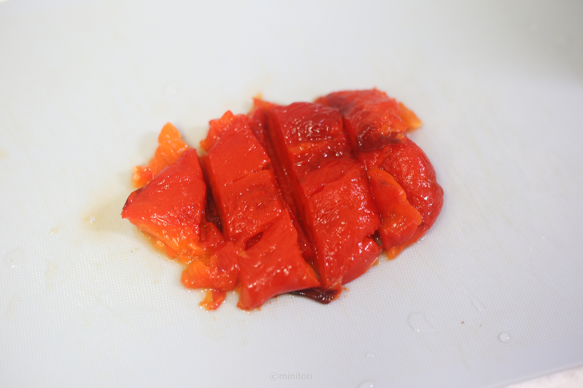 2. 구운 파프리카는 찬물에 헹궈 껍질을 벗긴 후 믹서에 갈기 적당한 크기로 썬다.