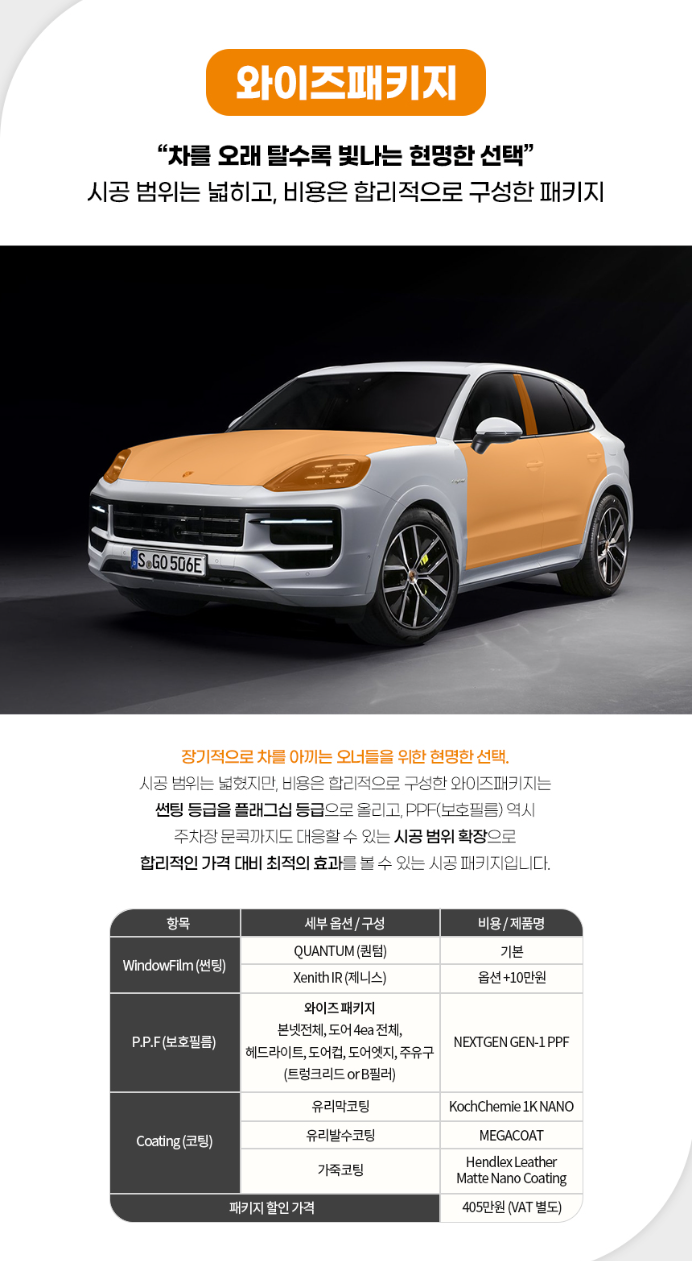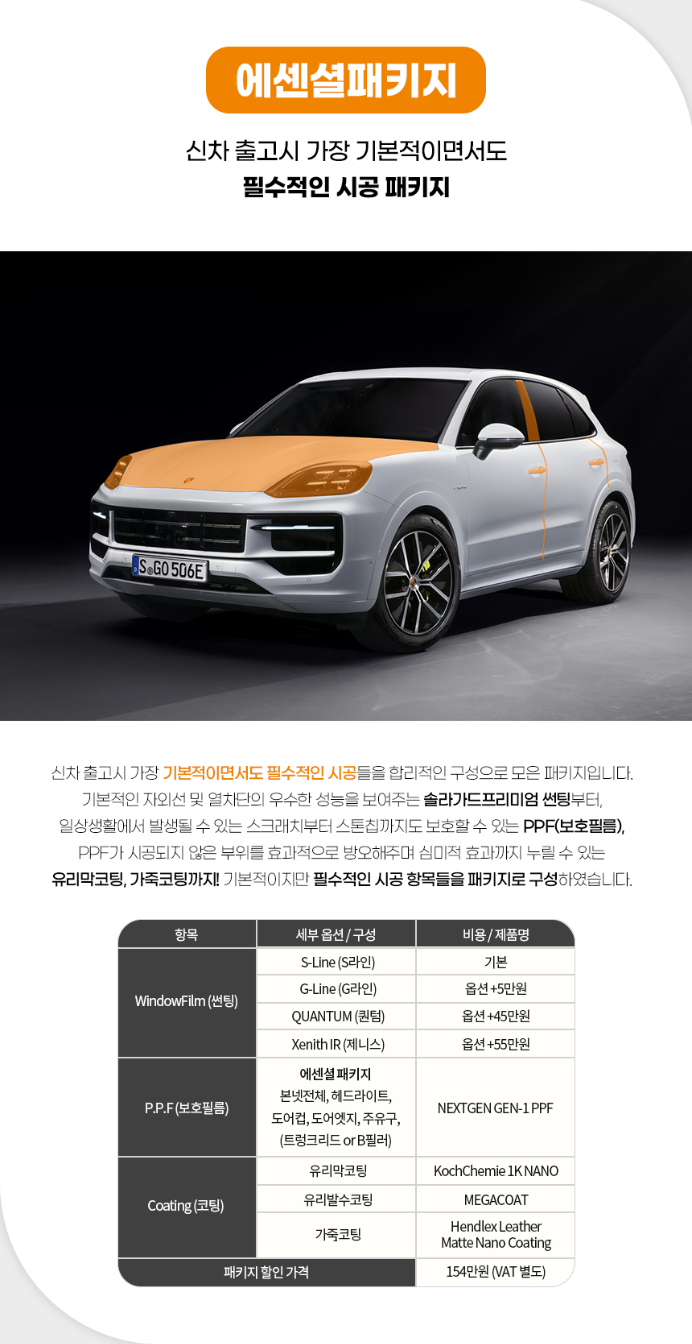 대전/충청권 최초 신차패키지 마스터즈샵인 '넥스트컴퍼니(넥스트레벨)'에서는 포르쉐 카이엔 전용으로 구성된 두 가지 파격적인 신차패키지 상품을 제공하고 있습니다. 그 첫번째가 에센셜패키지(핵심 보호 부위 중심의 기본 패키지), 두번째가 와이즈패키지(넓은 시공 범위와 완벽한 보호를 원하는 고객을 위한 프리미엄 패키지) 입니다.